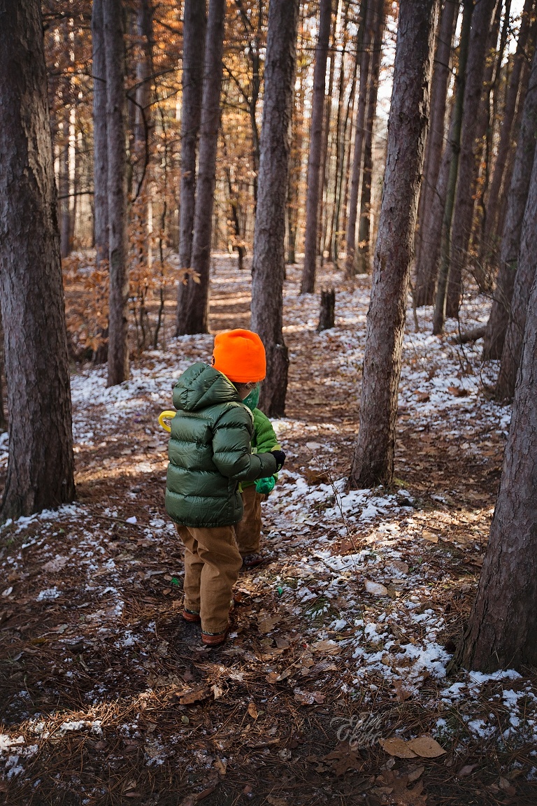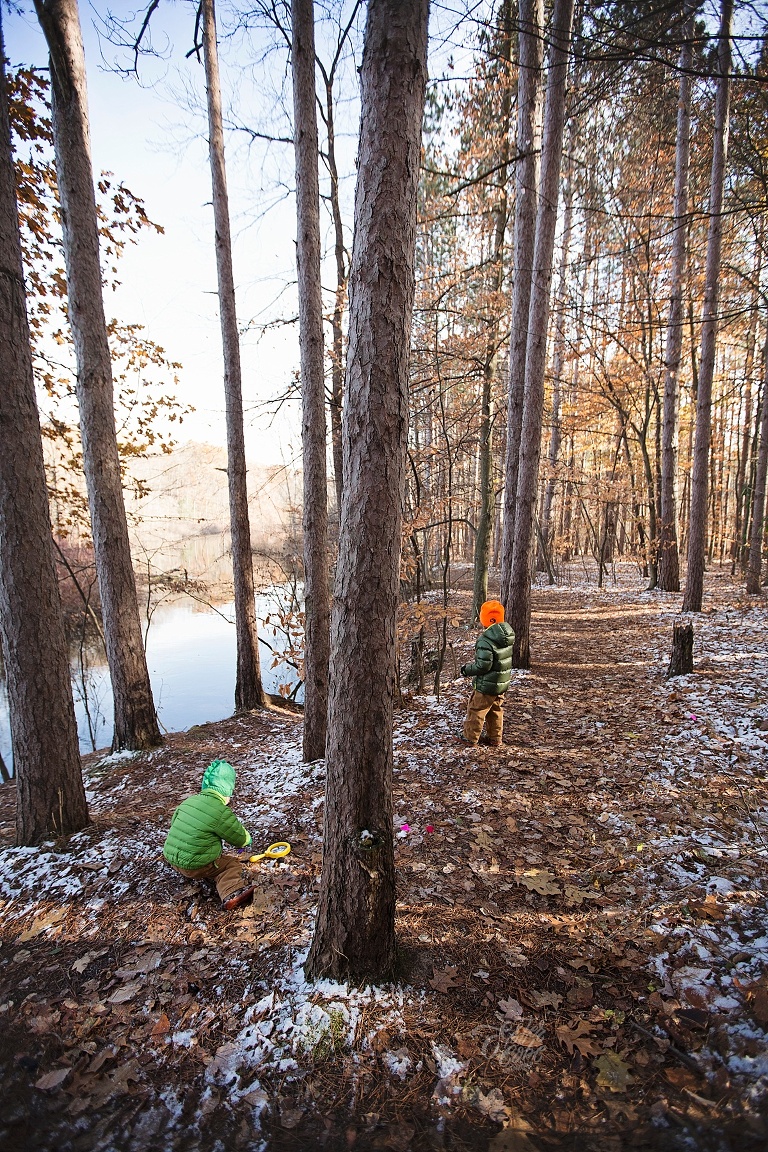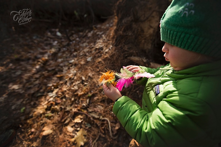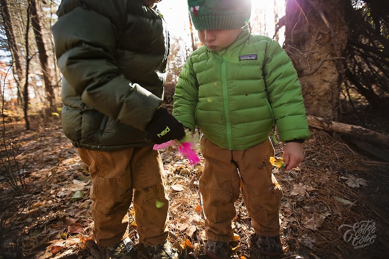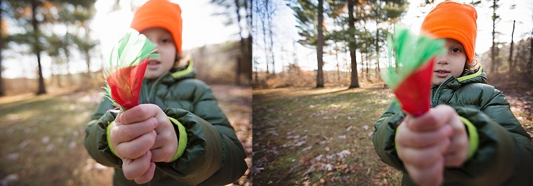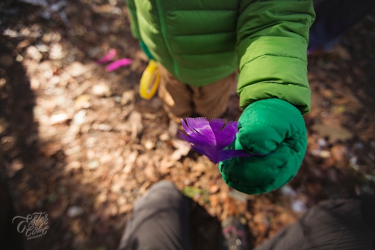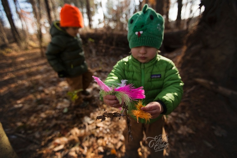 My sweet boys and I venture out on Monday mornings to “Nature’s House” a name given to the nearby state park by my oldest son. This Monday when we pulled into the lot he was extra not interested in joining in on the walk. He told me he wanted to go home or to stay in the car. Finally he decided he would come IF the stroller could be used so he could just relax. After much fussing and whining we began our little stroll. Little did he know we were on the hunt for wild turkeys for Thanksgiving. Hidden inside my snack bag was a large collection of feathers from making plump and perky turkeys during craft time. I know, you would think they would catch on… but they didn’t. I sprinkled feathers about while they weren’t looking… and sometimes right in front of them. The poor lonely stroller wasn’t used until Finley broke down from exhaustion. (two year molars and sleepless nights, yo) My oldest loved it. He couldn’t let a single one be left. He was a hugely successful turkey FEATHER hunter. Yes, I know… turkeys do NOT have fantasy colorful feathers in REAL life. This was magical though.